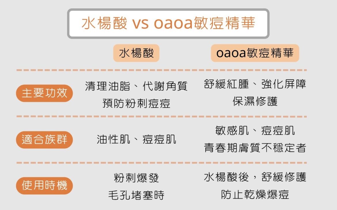 水楊酸可以快速代謝,但會帶來乾燥與刺激問題,oaoa 敏痘精華的修復保濕能彌補水楊酸的缺點,兩者搭配使用,才是痘痘肌的最佳解決方案!