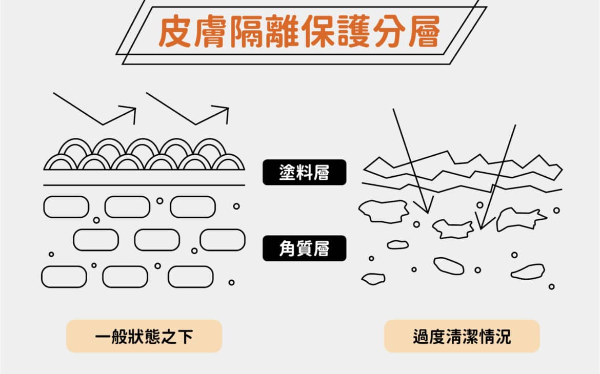 皮膚科醫師徐常捷指出,過度清潔肌膚會同時洗去皮膚上的皮脂,破壞皮膚表面的酸性保護膜(也就是前面提到的塗料層),讓皮膚失去自然調節的修復能力,甚至有可能變成敏感肌!
